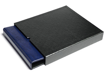 Deluxe padded binder available in Black, Blue, Green, Red and Brown. Binder size 280mm x 185mm x 60mm. Nine different page formats - suitable for postcards and various cigarette and trade card formats. Slipcase also available.